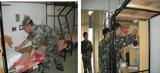 10月24日下午,以我系开展的寝室美化大赛为契机,文明寝室建设督查队对新生寝室进行了全面的检查和指导,文明督查队队员身着军装,以军人的标准全面指导寝室文明建设,其严谨、负责、正义的形象深入人心,对引导同学们养成良好的生活习惯起了积极的榜样作用。督查队队员对同学们的物品如何摆放问题提出了部队的摆放要求,并积极指导同学们的被子的折叠、鞋子的摆放、洗漱用品的统一放置及书架的摆放等等。