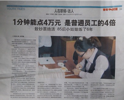 4月8日,《青年时报》、《新浪网》等媒体分别以“1分钟能点4万元,是普通员工的4倍”、“数钞票绝活 85后小姑娘练了6年”为主题专题报道了招商银行杭州分行85后员工,我院09届会计专业毕业生华沙沙。华沙沙以高水平的职业技能引起了社会的高度关注和赞誉,为母校争得了荣誉。