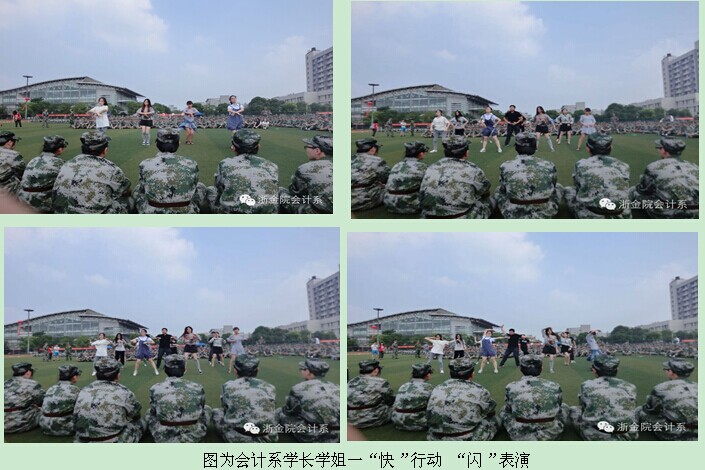 会计系大二的学长学姐们在操场上为大一的新生表演了一次快闪舞蹈,伴着《初智齿》的音乐,4位美丽可爱的学姐首先表演了一套完整的齐舞,点燃了三营队员的热情,掌声叫好声不断。紧接着《Louder》的伴奏响起,先前分散在四周的学长学姐们也加入进来,完成了一次完整的快闪表演。此次“快闪”活动是为参与本次军训的新生打气加油的鼓励活动之一,表演者均是来自会计系大二的学长学姐,其中有好几位学长学姐之前并没有舞蹈基础,但大家纷纷表示“能为辛苦训练的新生和教官加油打气,贡献一份自己的力量,那么花再多时间排练也是值得的。”