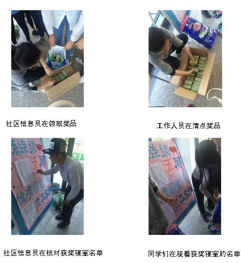 5月12日系部在桃李苑14幢楼下设好领奖点,获得连续五周的社区信息员陆续领取本班获奖寝室的奖品。系部肯定了优秀寝室同学们的共同努力,也为院系社区文明寝室建设树立了典型。系部衷心希望获奖寝室能再接再厉,营造社区文明寝室建设活动你追我赶,齐头并进的良好氛围。