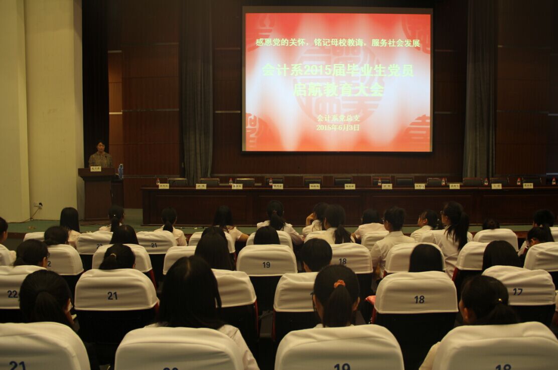 为深化对毕业生党员的后续教育,树立毕业生党员的先锋模范意识,会计系党总支于6月3日在明理报告厅举行2015届毕业生党员启航教育大会。系党总支副书记邵月花老师、辅导员陈小腊老师及2015届55位毕业生党员参加了此次大会。