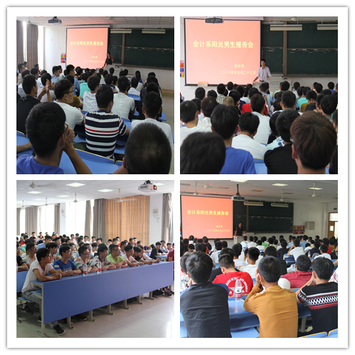 为了增强男生的责任感和使命感,合理规划学业生涯。会计系于9月23日下午,在7219教室召开2015级阳光男生报告会。会计系党总支副书记邵月花主讲,辅导员陈小腊、潘宁以及2015级全体男生参加。