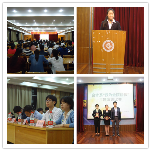 在建校四十周年校庆来临之际,为进一步增强学生爱校荣校的主人翁意识,会计系于10月19日晚6:30在浙商四楼诚信讲学堂举行了“我为金院骄傲”主题演讲比赛。会计系辅导员陈小腊、王玉龙、费含笑、潘宁,学生会主席王轶,副主席陈倩楠,辩论队队长王晓鹏担任本次大赛评委。2015级各班学生代表到场聆听。