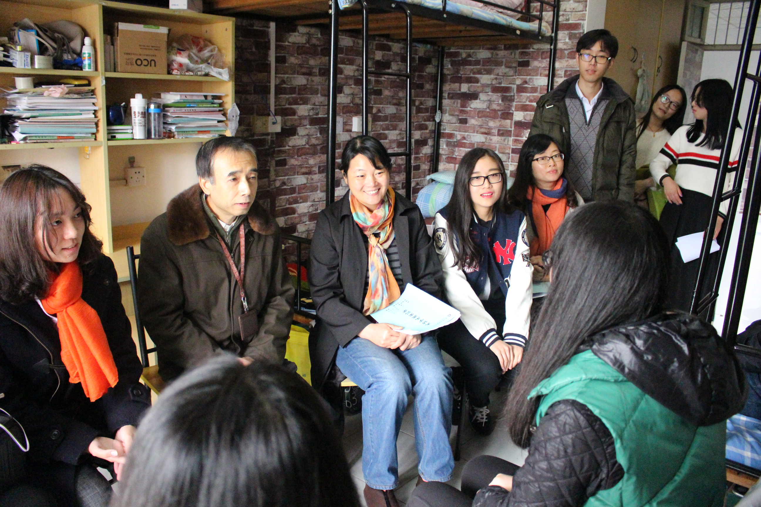 在2015年“爱生节”期间,为深入贯彻学院以生为本的育人理念,切实推进学生文明寝室的建设工作,了解新生的生活适应情况,11月30日上午学院纪委书记陈利荣走访会计系2015级学生寝室,会计系党总支副书记邵月花、学工办副主任王琴、辅导员潘宁等陪同走访。