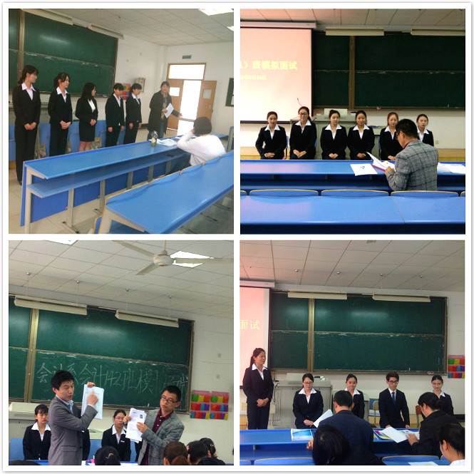 为提高我系2014级学生的现场应变能力,在即将到来的订单班面试中充分展现才能,会计系以班级为单位在4月份开展了千人模拟招聘活动。本次活动从4月11日正式启动,各班学生积极准备、自信应对。会计系党总支副书记邵月花、2014级全体班主任和各年级辅导员以面试官的身份参与此次模拟面试。
