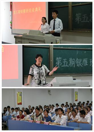 会计系于6月23日中午在7219教室召开了第五期银雁班结业典礼,会计系党总支副书记邵月花、学工办副主任王琴、辅导员王珠珠、潘宁、王心怡出席本次活动,会计系主席团成员以及银雁班全体学员到场参加。