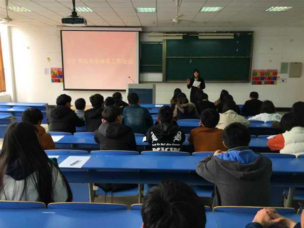会上,邵月花肯定了我院学生在2016学年各项体育工作上取得的成绩,她鼓励在座的体育委员们起好先锋带头意识,积极带领班级同学在之后的体育项目中争创佳绩,屡创新高。她重点部署了即将到来的“千人趣味运动会”的相关事宜,强调大家要以本次活动为契机,全面落实“走下网络、走出寝室、走向操场”的健身理念,充分响应学校“每天运动一小时,健康工作五十年,幸福生活一辈子”阳光体育的正能量号召,加强体能锻炼,培养合作精神,促进优质就业。最后,她还就晨跑轮操的请假制度做了一些规定,希望同学们阳光体育,焕发自我。