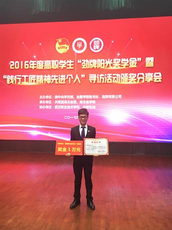 近日,团中央学校部公示了首届高职学生“劲牌阳光奖学金”暨“践行工匠精神先进个人”寻访活动特别奖获奖人名单。经校级推荐、省级遴选、网络展示投票和专家评审,我院2014级会计专业董佳康同学荣获首届高职学生“劲牌阳光奖学金”特别奖。