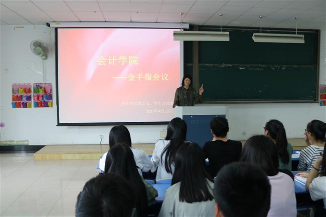 为提高同学们的技能水平和综合素质,培养一批技能优、心态佳、能力强的技能尖子,会计学院于4月25日中午12:40在7319教室召开了金手指会议。会计学院党总支副书记邵月花,学生会副主席华梦婕,技能部部长倪江良以及百名金手指技能尖子到场参加。会议由倪江良主持。