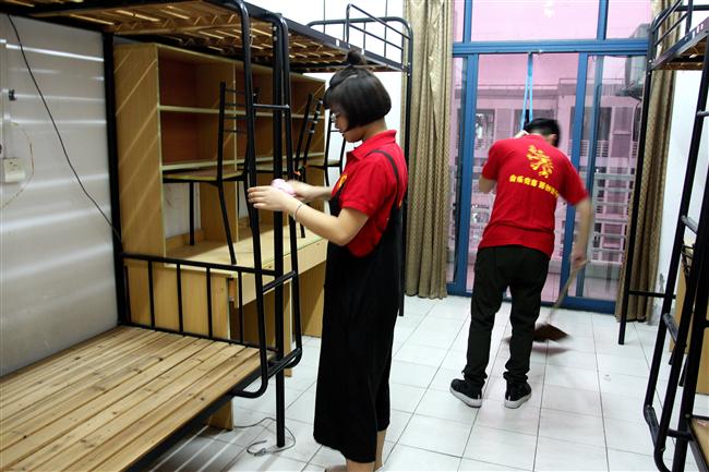 团学成员统一身着“小红衣”来到各自需要打扫的寝室楼下,合理分配工具,有序排好列队,明确打扫分工。他们热情洋溢,准备充分,积极投入到打扫工作中去。新生宿舍由于毕业生离校已久,宿舍灰尘堆积,有的是门窗破损,更有甚者宿舍里遗留些垃圾杂物,严重影响了宿舍的整体和谐,也给清洁工作造成很大的不便。即便如此,参与清洁活动的同学们对此毫无怨言,大家相互配合,一齐出力,以细致的工作态度和认真的工作作风落实打扫工作,场面热火朝天。擦拭桌椅、去除污渍、清洁地板,不留下任何一个死角。经过打扫,寝室焕然一新,干净整洁,大家感到非常有成就感。