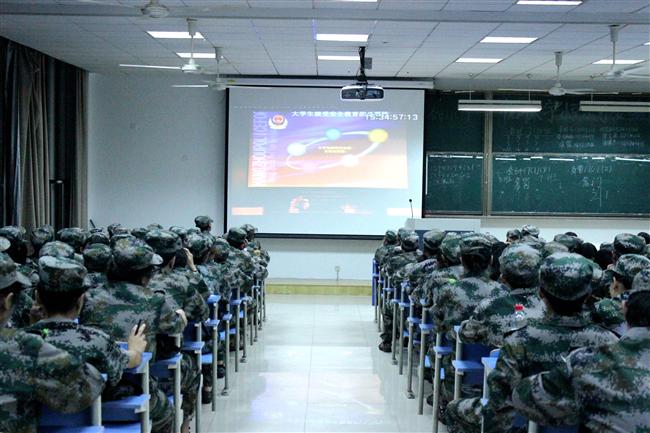各个班级内,教官为新生们播放有关安全教育的视频,视频内着重向新生介绍了学风学纪制度和寝室卫生制度,要求新生无论在教室中还是寝室里要懂得遵纪守法,怀有优化意识,共筑文明新风。另外,视频介绍了有关校园、寝室、网络等方面的安全隐患情况,并呈现真实案例告诫同学们要加强防范意识,谨记安全第一。