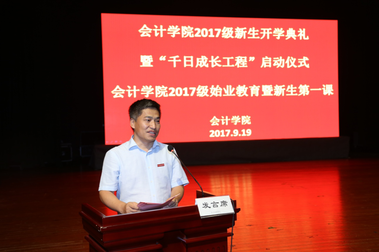 9月19日,会计学院2017级新生开学典礼暨“千日成长工程”启动仪式在金葵花艺术中心隆重举行。出席本次大会的有学校纪委书记陈利荣研究员,学校教务处处长、会计学院院长孔德兰教授,会计学院党总支副书记、副院长王忠孝教授,副院长李华副教授、姚军胜副教授,各专业主任、副主任,2017级新生班主任与全体辅导员。会议由会计学院党总支副书记邵月花主持。