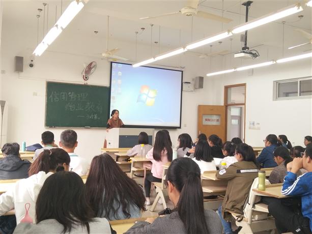 朗朗金秋迎新生,袅袅桂香庆盛典,2017年10月12日上午,会计学院信用管理专业2017级新生始业教育动员大会在7410和7412举行。信用管理教研室副主任于玲燕老师和陈树元老师及全体2017级新生参加会议。