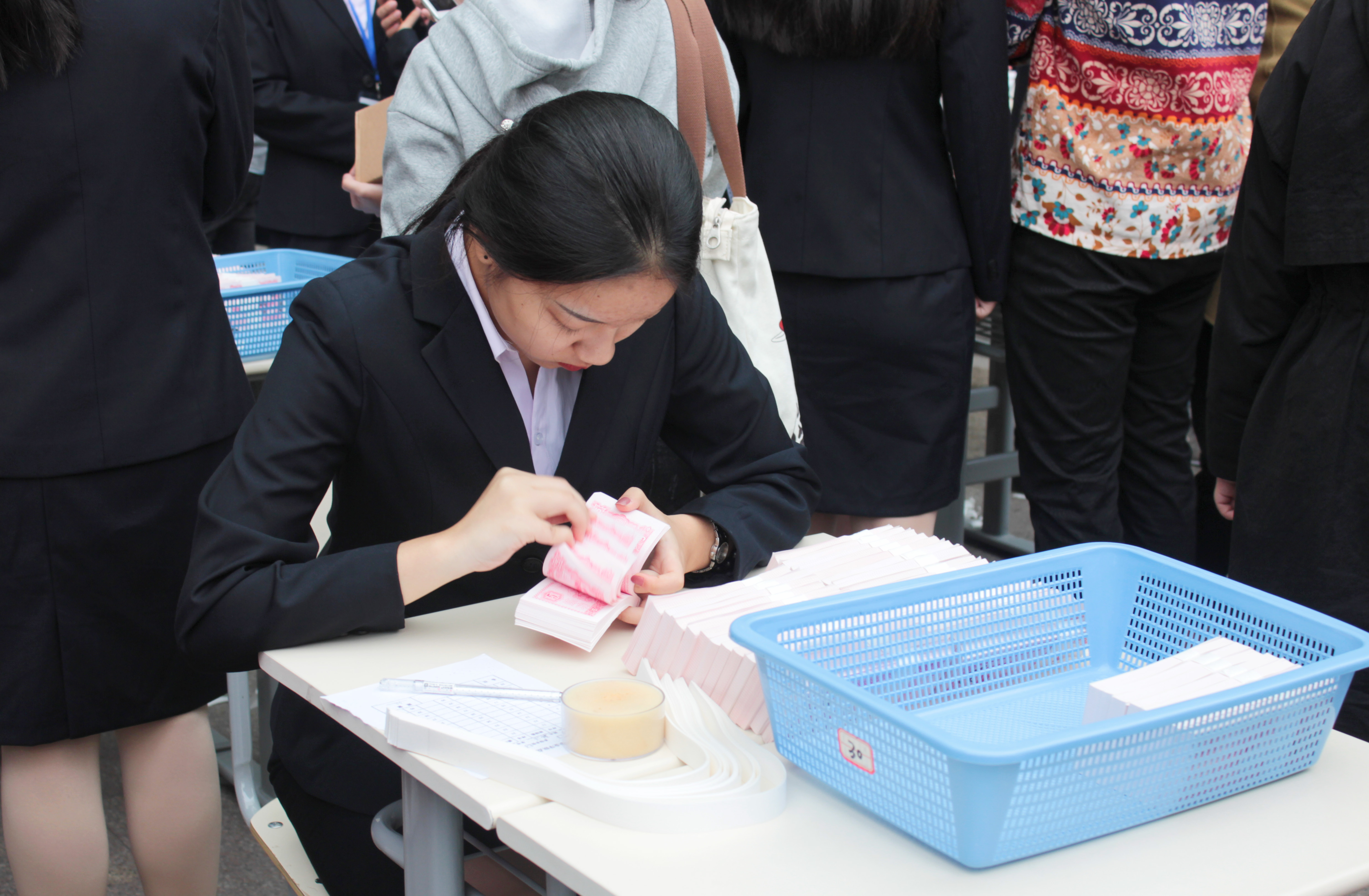 大会伊始,会计学院党总支副书记邵月花发表讲话,她借助我院优秀校友的先进事迹,鼓励全体同学在技能练习上明确目标、勤奋练习,向模范学习,圆成长之梦。接着,技能尖子代表会计16(10)班杜啸霖上台发言,他分享了自己的学习方法,并向同学们介绍了接触技能、培养兴趣、坚持不懈、不断收获的技能训练过程。随后,牟君清宣读了百名“金手指”技能尖子比赛成绩,对技能尖子进行表彰。紧接着校团委书记李佐宣布仪式正式启动。优秀选手开始技能风采展示,“唰唰唰”的声音响起,点钞券随着灵巧的手指上下翻飞,拆把、点数、扎把、计数,一气呵成,令人叹服。“砰砰锵锵”按键随着灵活的手指不断变化,文章词句在短短数分钟时间内完成。他们娴熟的操作、认真的态度充分展现了其良好的精神风貌和过硬的技术能力。期间,领导们前来慰问,指明方法、设定目标,老师亲自指导,参赛选手从手法到坐姿都严格要求自己、规范自我,观众们拍手称奇,赞叹不已。