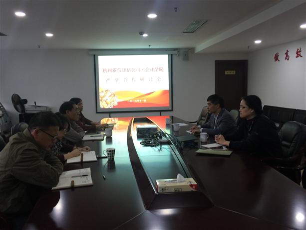 2017年11月17日上午,会计学院副院长王忠孝、副院长李华、信用管理教研室副主任于玲燕一行到杭州资信评估公司走访,并就产学合作进行了深度研讨,受到了杭州资信评估公司邵兴忠总经理、范芳副总经理等人的热情接待。