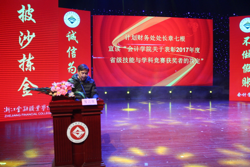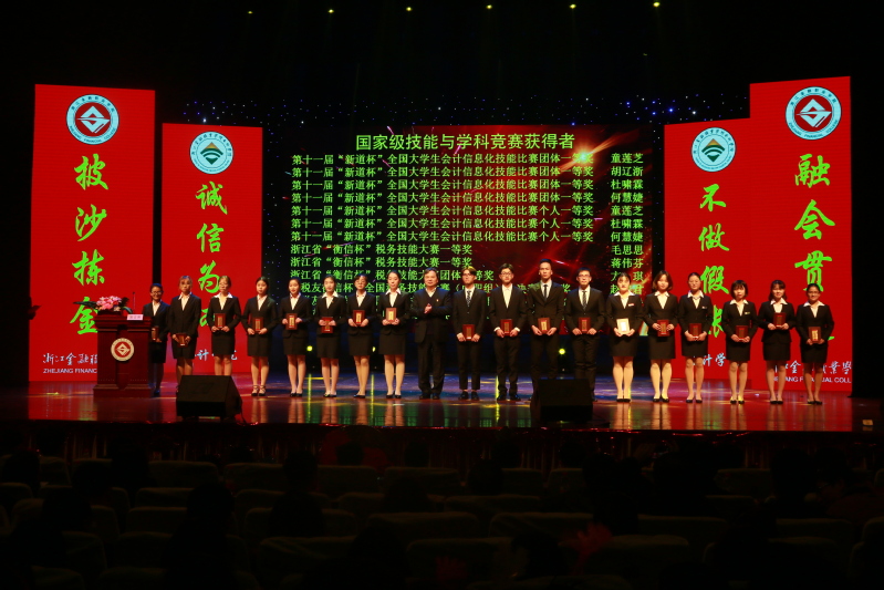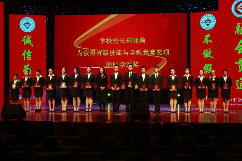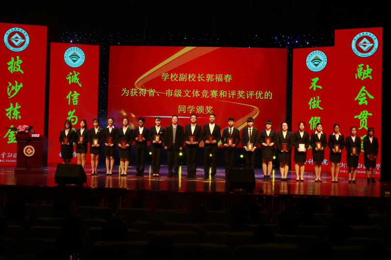 接着,孔德兰、章七根、张鹏超老师分别宣读了2017年度在国家级技能与学科竞赛、省级技能与学科竞赛以及国家、省、市级文体竞赛中取得突出成绩的同学名单,周建松、郑亚莉、郭福春等校领导为受表彰同学颁奖。