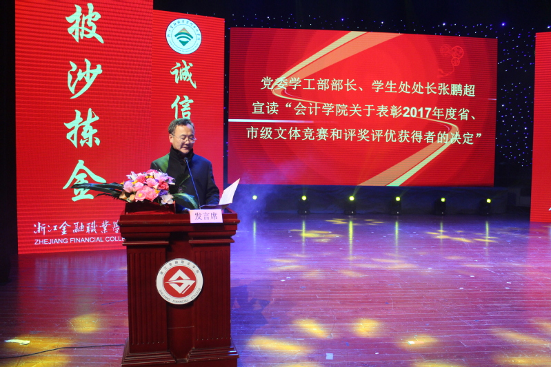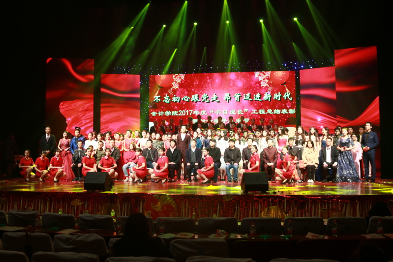 在全国上下认真学习贯彻党的十九大精神之际,为树立典型、表彰先进,会计学院于12月13日晚在金葵花艺术中心隆重举行2017年度“千日成长”工程表彰大会暨财会学子风采节活动。学校党委书记周建松,学校校长郑亚莉,学校副校长郭福春,教务处处长、会计学院院长孔德兰,党委学工部部长、学生处处长张鹏超,计划财务处处长章七根,纪检监察办主任、审计处处长龚宏富,人民武装部部长、保卫处处长黄中梁,河南济源职业学院学工部部长、学生处处长李会联,河南济源职业学院经营管理系主任孙德营,安徽商贸职业学院艺术设计系党总支书记魏力,团委书记李佐,学生处处长助理施技文,会计学院党总支副书记、副院长王忠孝,副院长李华,副院长姚军胜,以及会计学院全师生及兄弟学院师生出席表彰大会。大会由会计学院党总支副书记邵月花主持。