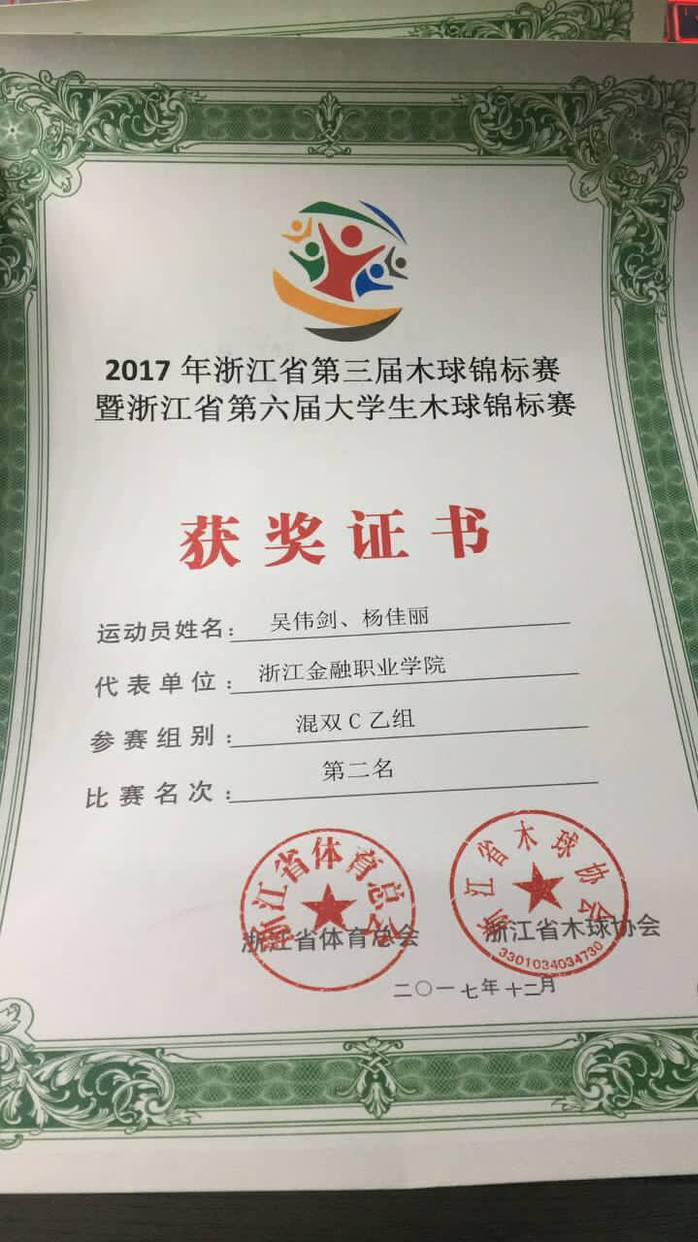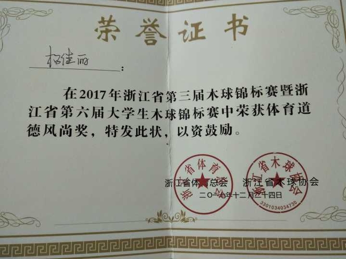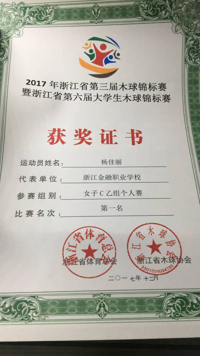 近期,好消息传来,会计178班杨佳丽同学在“”浙江省第三届木球锦标赛暨浙江省第六届大学生木球锦标赛中获得女C乙组个人赛第一名、体育道德风尚奖,还同我校吴剑伟同学一起获得混双C乙组第二名。