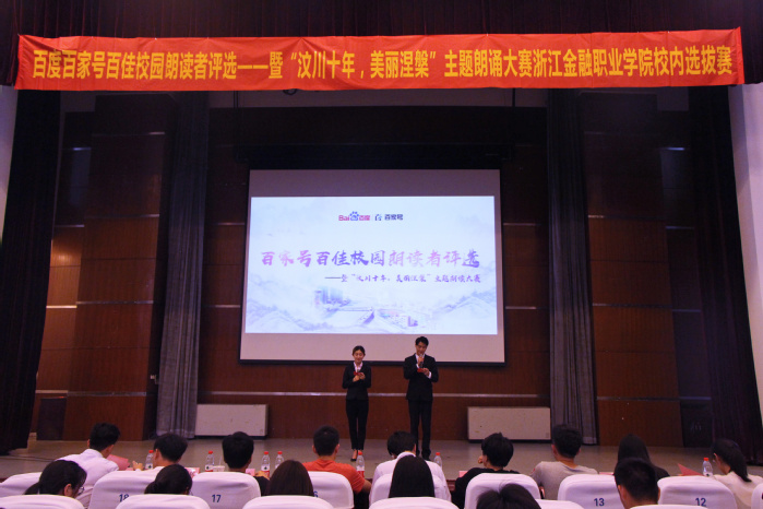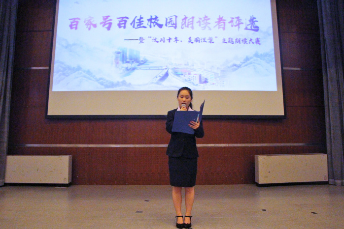 为纪念汶川地震十年,悼念地震中逝去的同胞英灵,同时锻炼金院学子的朗诵水平,丰富同学们的课余生活,为百度百家号输送优秀人才,会计学院于5月14号晚上6:00在明理报告厅举办百度APP与大型文化节目朗诵者品牌联袂推出“汶川十年,美丽涅槃”朗读纪念活动的校内选拔赛决赛。比赛经过校内演讲比赛初赛的激烈角逐,共有21位选手脱颖而出进入决赛。会计学院辅导员潘宁,会计学院学生会主席刘栋以及各二级学院学生会干部担任此次比赛评委。陈波和李观祥担任这次活动的主持。