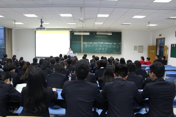 吴晓霞首先从什么是礼仪、礼仪的内涵和核心、礼仪的作用三点内容展开叙述。她指出,礼仪即是礼貌、礼节、仪表、仪式。礼仪的内涵和核心是尊重,面试过程中的礼貌之举是对他人的尊重;面带微笑,在面试中将有事半功倍的效果。此外,礼仪的作用在于让我们更好地施展自身的魅力,表现突出。她例举人际交往中的魔鬼数字“73855”,提醒同学们要注重倾听、注意语音语调及外在形象和肢体。