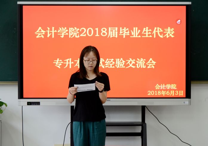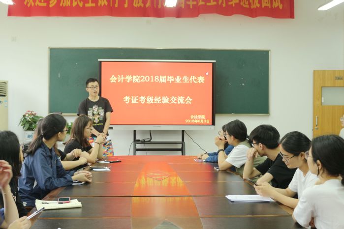 为了进一步激发同学们学习的热情,增加对学习的动力,进一步加深对专升本和考证考级的认识,会计学院于6月3日在7218会议室开展2018届毕业生代表专升本、考证考级经验交流会。参加此次交流会的有会计学院辅导员潘宁,2018届专升本优秀代表王梦怡、管舟舟、王婉仪、王倩倩,2018届考证考级优秀代表刘雨涵、倪江良、马丽、曹谷城以及会计学院学生代表。此次交流会由潘宁主持。