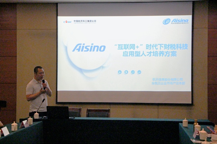 航天信息股份有限公司金税本部培训产业专项项目产品部经理杨克辉做“互联网+” 时代下财税科技应用型人才培养方案的介绍。