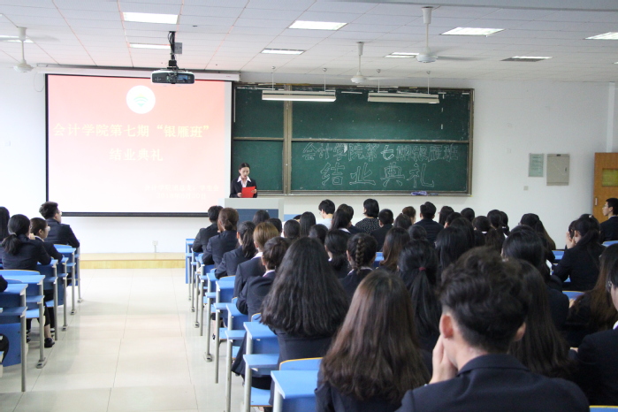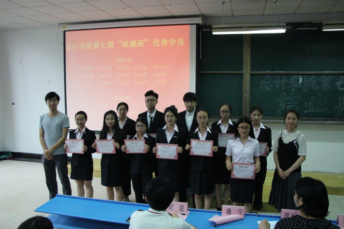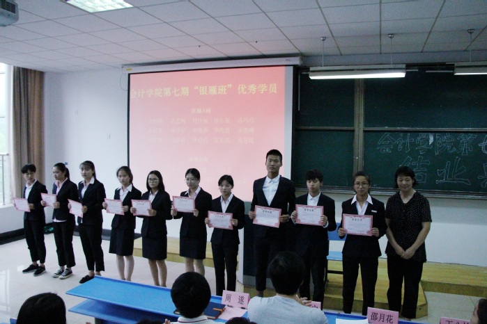 为了更好地总结银雁班学习成果,表彰优秀学员,会计学院于6月20日下午15:30在7219教室举行第七期银雁班结业典礼。出席此次结业典礼的有会计学院党总支副书记邵月花,会计学院辅导员潘宁、王心怡、周遂、廖子乐,2016级主席团成员以及银雁班全体同学。此次结业典礼由吴苏媛主持。