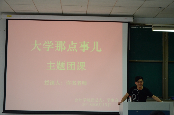 为了帮助同学们更深的了解大学生活,给同学们指明努力的方向。6月19日下午16:00,会计学院于7219教室开展“大学那点事”主题团课。本次团课由校团委副书记许杰老师授课,会计学院第七期“银雁班”全体成员参与了本次团课。