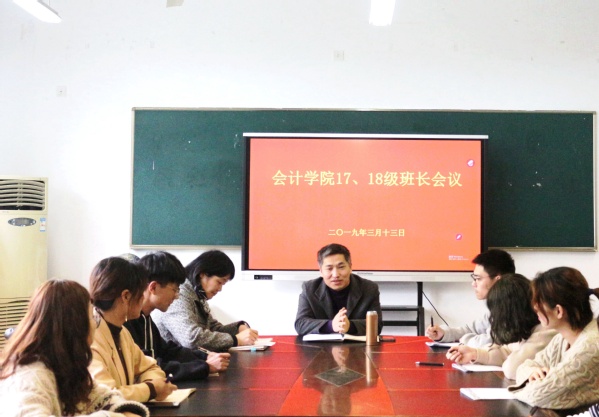 为了增强学生的自主学习意识,营造良好的学习氛围,2019年3月13日下午三点,会计学院于7218会议室召开2017、2018级班长会议,会计学院党总支副书记、副院长王忠孝开展学业指导工作。会计学院党总支副书记邵月花,辅导员周遂、金恩芳以及2017级、2018级全体班长参加会议。