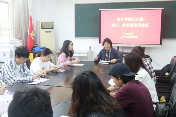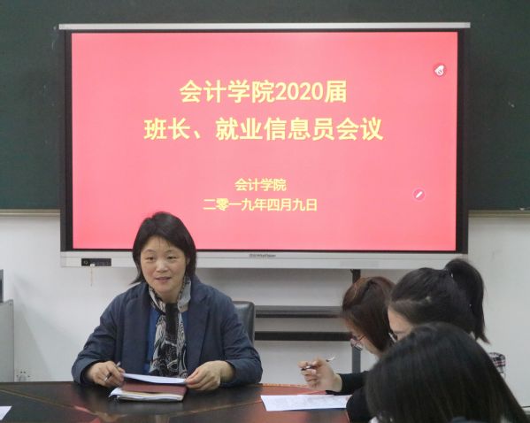 为保障2020届学生就业工作有序开展,4月9日会计学院于7218教室召开2020届班长、就业信息员会议。出席本次会议的有会计学院党总支副书记邵月花,辅导员周遂、金恩芳、吴诗怡。