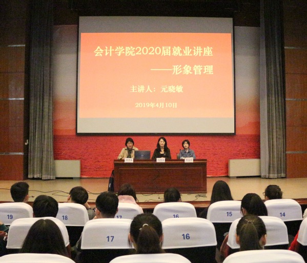 面对严峻的就业形势,为了进一步加强我院的就业工作,分析当前就业形势,填报好订单就业单位,成功寻找好人生第一份工作,解决好当前就业工作过程中出现的各种问题,使我院就业指导工作更规范、更科学、更有效,会计学院于2019年4月10日在明理报告厅召开了2020届就业指导讲座。本次讲座由浙江理工大学形象设计资深讲师元晓敏、会计学院党总支副书记邵月花主讲,2020届全体学生参加了此次讲座。