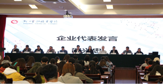 蒋秀东会长简单介绍了浙江省信用发展的现状及前景,并表示学历只是敲门砖,但是真正有价值的是学生自身扎实的专业知识,他还分别从一账一信、红黑名单、联合惩罚、信息共享、信息公示五点给学生讲述了当下信息时代的核心。