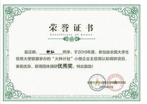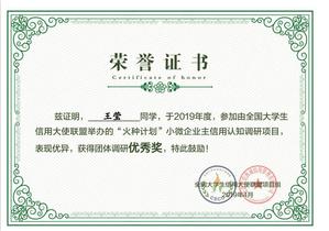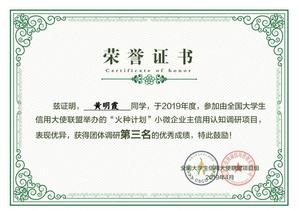 2019年4月29日,2019年度全国大学生信用大师联盟“火种计划”小微企业主信用认知调研大赛落下帷幕。由黄明霞、庞银燕、傅秋霞组成的参赛队伍获得三等奖,由钟灿、孙利群、王莹组成的参赛队伍获得优秀奖,指导老师为于玲燕。