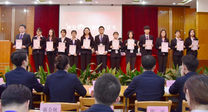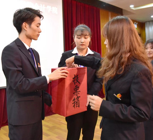 稍后,开展2019年会计学院学生干部换届竞聘大会。首先,会计学院团总支副书记陈冠儒、华凯熠以及会计学院学生会主席孙小强作了详细的团学工作报告,同时他们表述了对新的学年美好的展望,告诫团学干部不忘初心。接着,他们向我们展示了一年来团学干部和学生会干事取得的荣誉及成就。