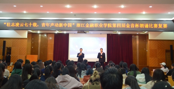 为丰富课余生活,绽放青春魅力,11月13日晚7:00,由共青团浙江金融职业学院委员会主办,会计学院团总支学生会承办的浙江金融职业学院第四届“金音杯”复赛在诚信讲学堂隆重举行。本次比赛由周炯、潘海洋主持,2017年演讲与口才副会长、朗诵团团长、广播台台长罗国青,人文艺术学院前宣传部部长、第二届金音杯二等奖得主乔艺,金口才指导与服务中心主任吴苏媛,浙江省第七届大学生中华经典朗诵比赛一等奖得主胡佳俐,金色校园电视台副台长茹喆,朗诵团团长施渊涛,第三届金音杯二等奖得主方晨希作为本次比赛的评委。