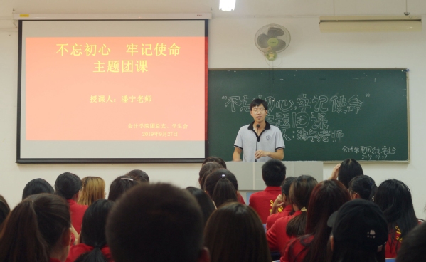 为了进一步激发青年团员的家国情怀,把爱国情、报国志融入伟大奋斗,传承和弘扬爱国奋斗精神,争做新时代的奋斗者,9月27日会计学院于7305教室开展“不忘初心,牢记使命”主题团课。本次团课由团总支书记潘宁主讲。