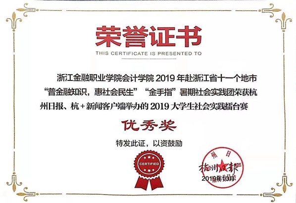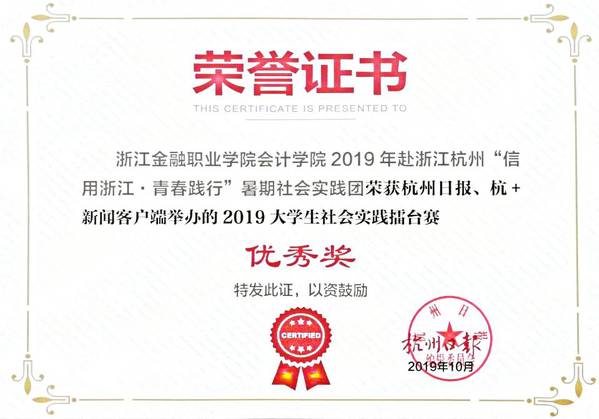 近日,杭州日报、杭+新闻客户端举办的2019大学生社会实践擂台赛落下帷幕。会计学院赴浙江省十一个地市“普金融知识,惠社会民生”“金手指”暑期社会实践团、“信用浙江·青春践行”暑期实践团在比赛中荣获优秀奖,邵月花、陈小腊、陈树元获最佳指导老师奖。
