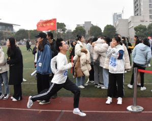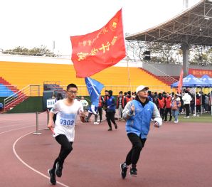 会计学院依旧难掩飒爽风姿。华夏运动场上印满了他们努力冲向成功的足迹,他们迎着寒风,手中紧紧握住接力棒,从那一闪而过的眼眸里,掠过必胜的坚定信念。跑道一旁是举旗追赶的志愿者,高高飘扬的院旗猎猎作响,仿佛在歌唱胜利的战歌。志愿者尽心的陪跑也是一道靓丽的风景线,使这场在寒冬中进行的长跑多了几分暖意。
