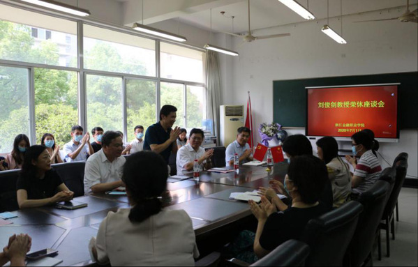 会议伊始,周建松书记发表讲话。他表示,刘俊剑同志为浙江金融职业学院奉献出了自己的青春与汗水,对会计学院的茁壮发展、评估公司的发展壮大作出了巨大贡献。刘俊剑同志在32年的职业生涯中,除了承担日常的教学任务和负责日常的管理工作外,还积极探索高职专科教育,为高职教育的发展添砖加瓦。周建松书记衷心祝愿刘俊剑同志拥有更加光辉灿烂的明天!
