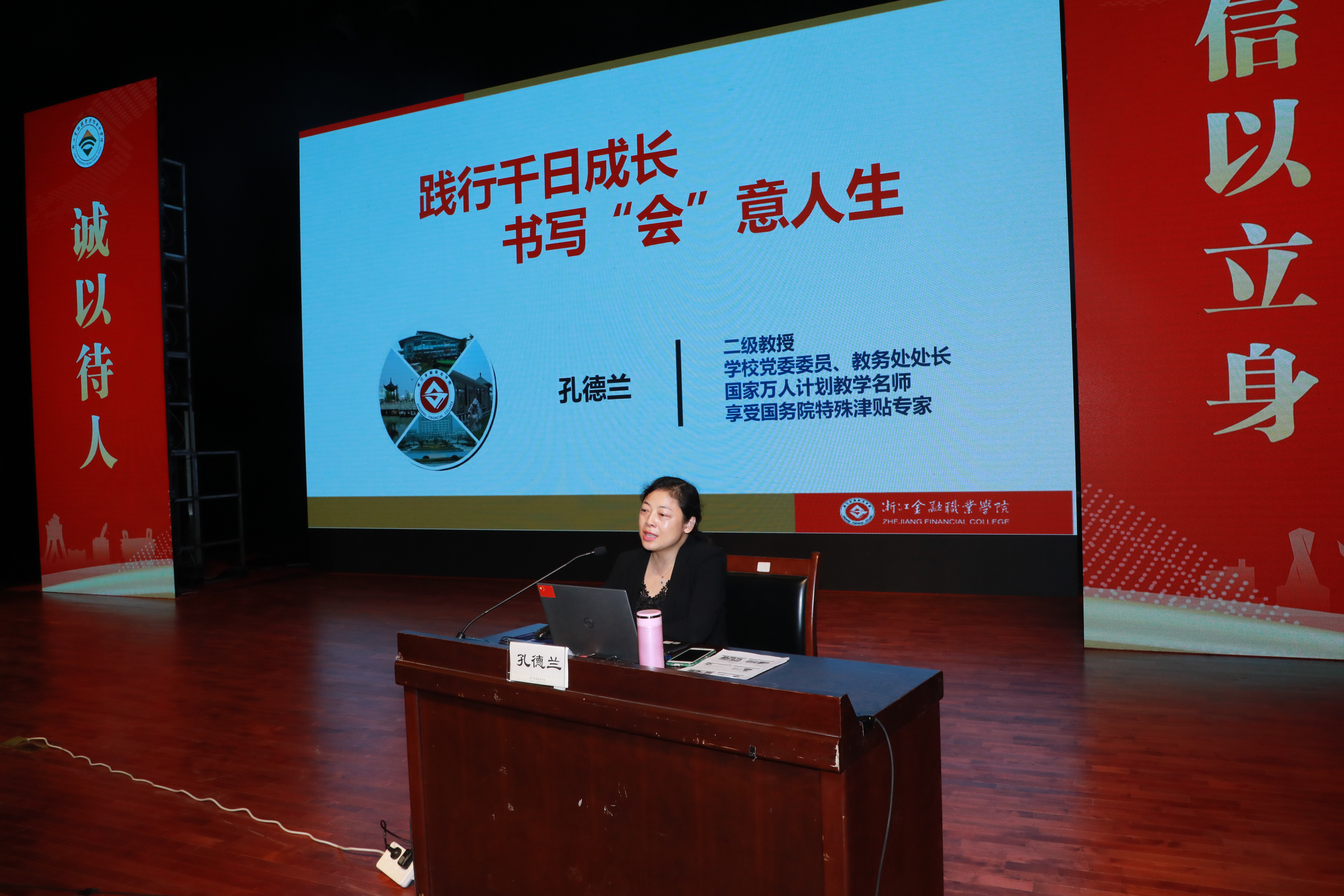 学校党委委员、教务处处长孔德兰教授首先对2020级新生的到来表示热烈的欢迎,接着围绕“践行千日成长、书写‘会’意人生”主题为新生讲授了精彩纷呈的第一课。她首先全面详细介绍高等职业教育的由来、特征以及目前我国高等职业教育的发展概况,然后细致地讲解了金院的发展历程、取得成果、杰出校友、学校文化,并非对学校未来发展进行了展望。最后在介绍了会计学院的基本情况、教学成果和育人成绩基础上,并详细指导了学生如何规划千日成长,希望同学们要找准自身定位,加强专业知识学习,适应数字化、人工智能化的当代社会,最终成为一名高素质技术技能型会计人才。同时她鼓励同学们一定要充分把握好在校1000天,夯实专业基础,常怀进取之心、包容之心、感恩之心和敬畏之心,实现自身的成长成才。孔德兰的授课声情并茂,深入浅出,现场掌声不断。