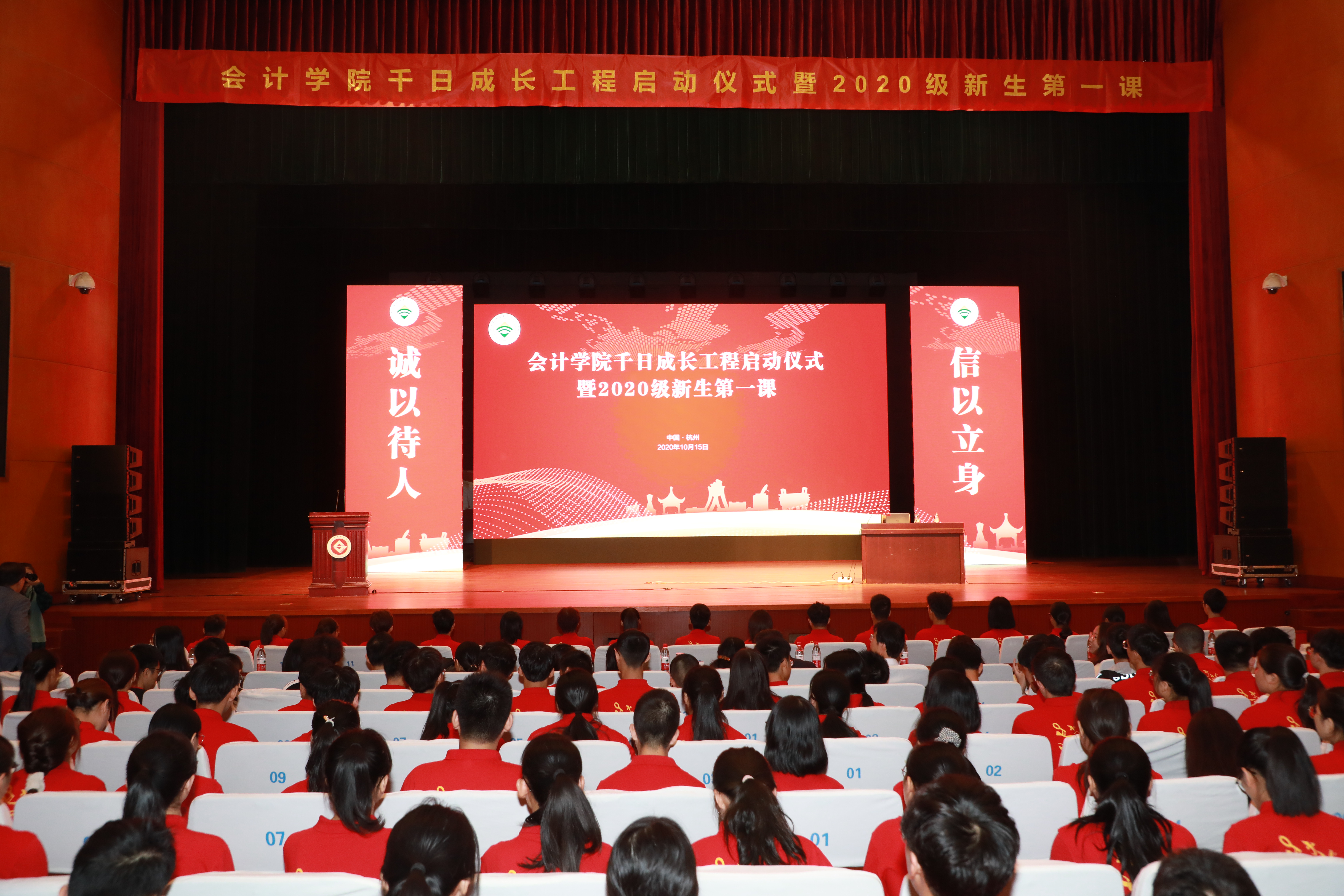 10月15日上午,会计学院千日成长工程启动仪式暨2020级新生第一课在金葵花艺术中心举行,学校党委委员、教务处处长、会计专业群主任孔德兰,会计学院党总支书记、院长王忠孝,会计学院副院长张薇,会计学院党总支副书记张惠君,会计学院各教研室主任、副主任,办公室老师,2020级新生班主任、全体辅导员、全体新生参加了本次活动。