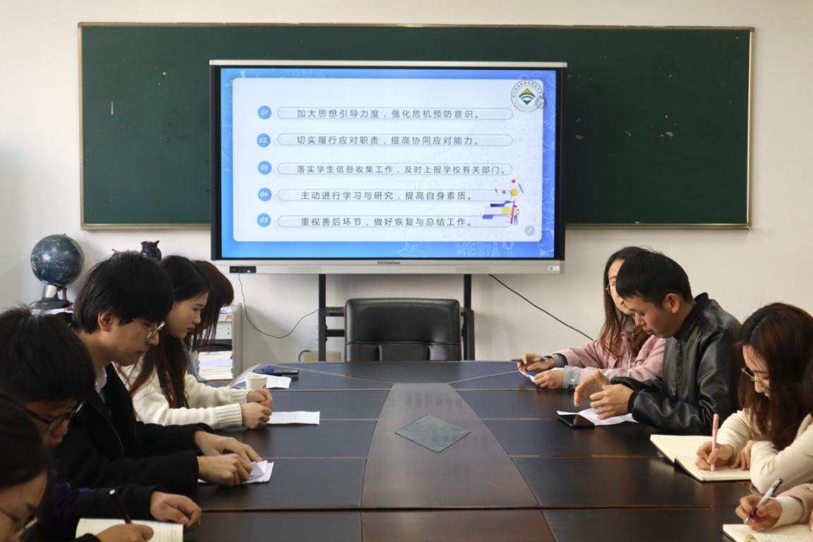 会议伊始,先由会计学院学工办老师,通过情景剧再现的模式生动具体地讲述案例的发生、发展过程及处理措施。模拟结束后,会计学院辅导员从事前预警、事中应对、事后总结以及日常落实等方面,囊括出了以下五点:一、加大思想引导力度,强化危机预防意识;二、切实履行应对职责,提高协同应对能力;三、落实学生信息收集工作,及时上报学校有关部门;四、主动进行学习与研究,提高自身素质;五、重视善后环节,做好恢复与总结工作。