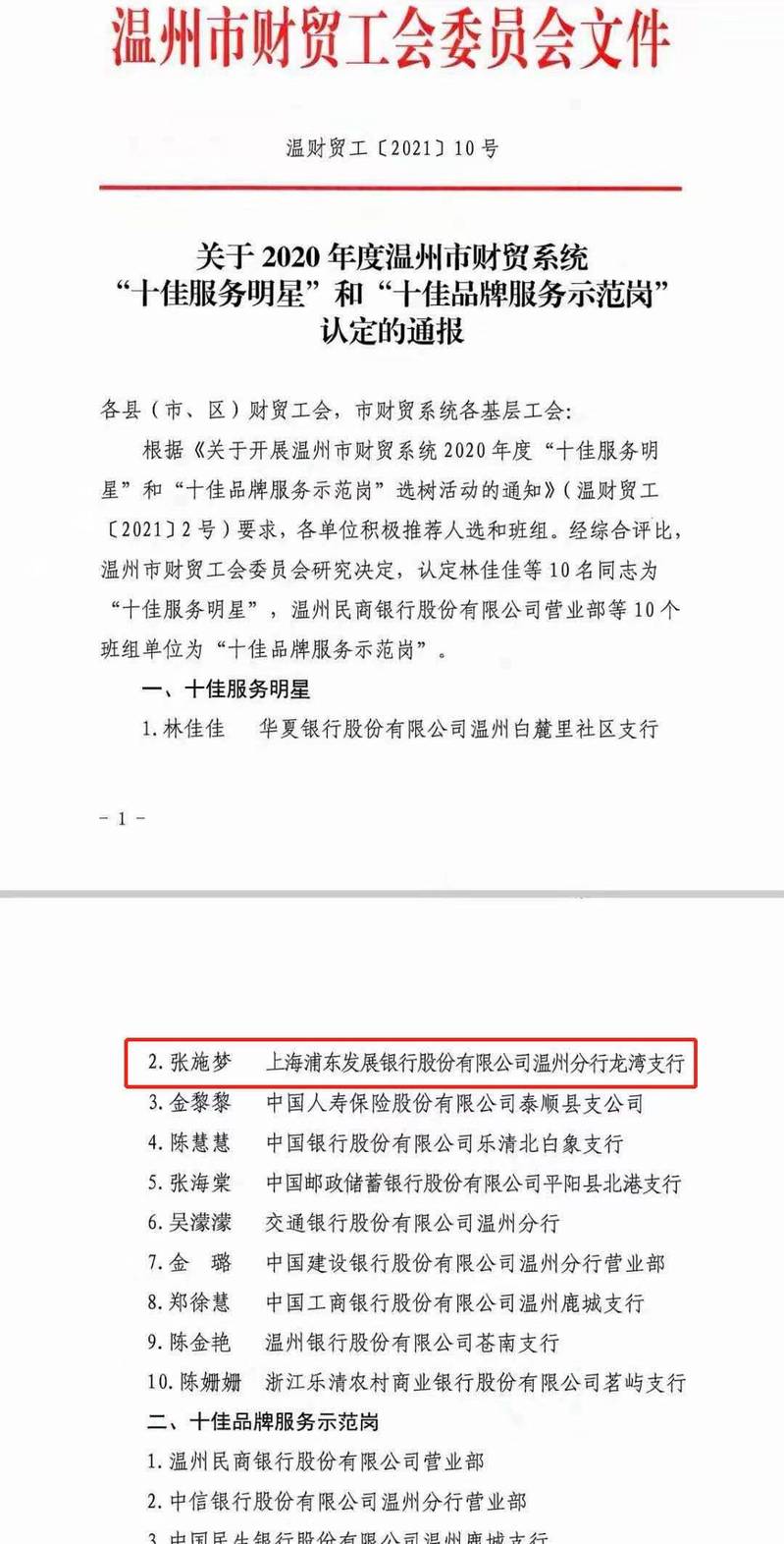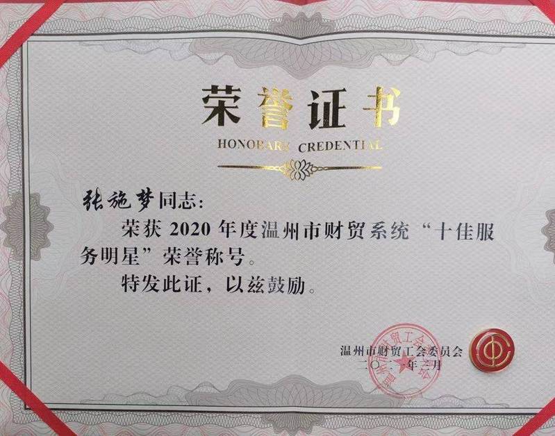 根据《关于开展温州市财贸系统2020年度“十佳服务明星”和“十佳品牌服务示范岗”选树活动的通知》(温财贸工[2021]2号)要求,各单位积极推荐人选和班组。经综合评比,温州市财贸工会研究决定,认定张施梦为“十佳服务明星”。