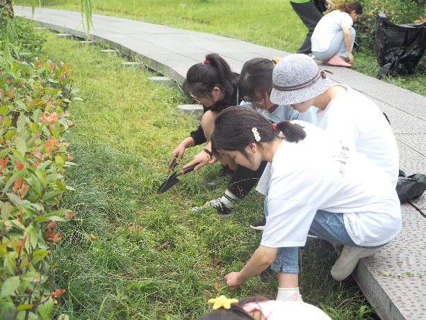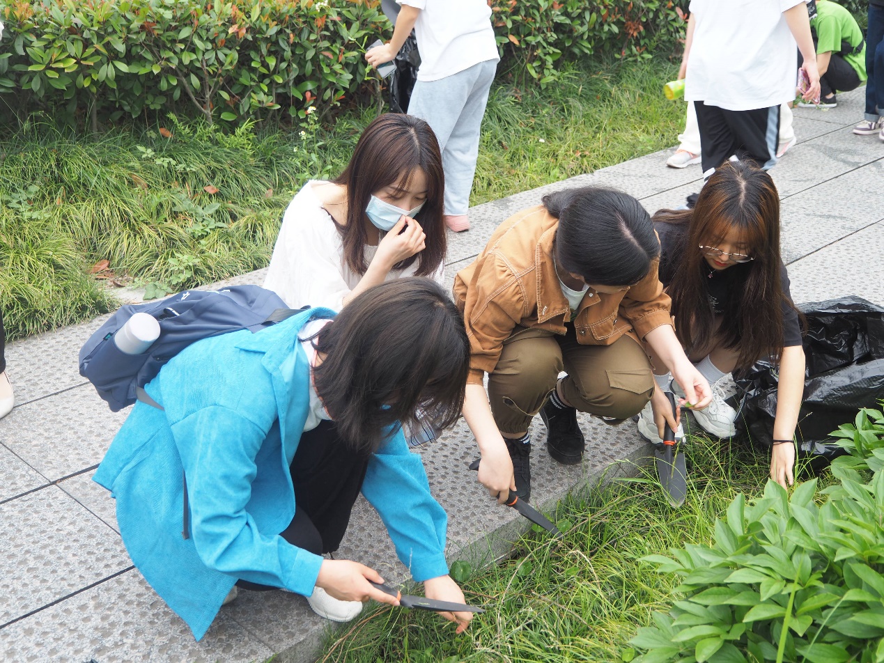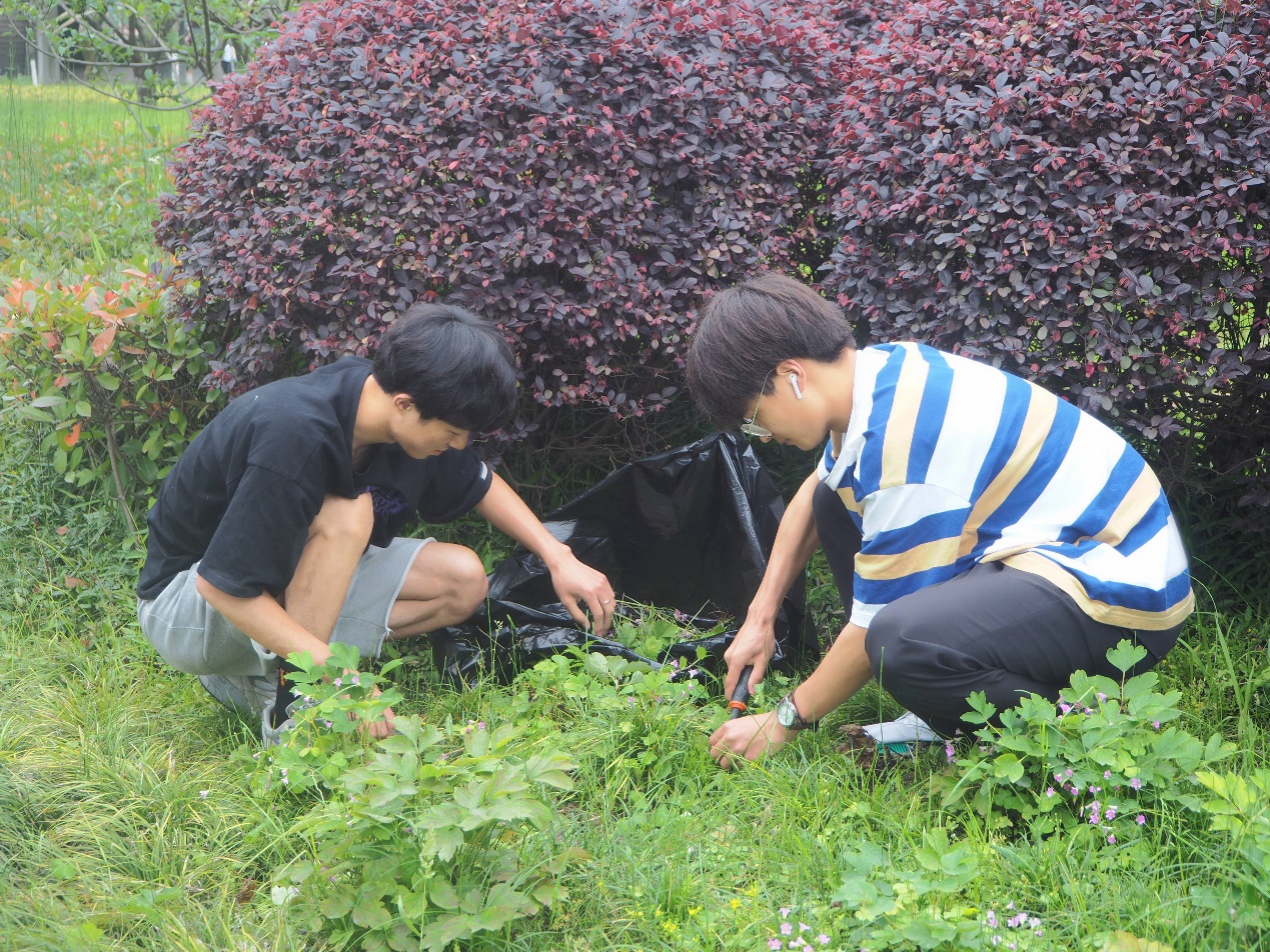 除草过程中,志愿者们不偷懒、不埋怨,认真仔细地拔除草坪周边的杂草,清理草坪上的垃圾。尽管天气闷热,除草耗费了大量体力,但是他们依旧热情洋溢,在劳动中寻找乐趣,展现了会计学院学子勤劳负责、积极向上的风采。