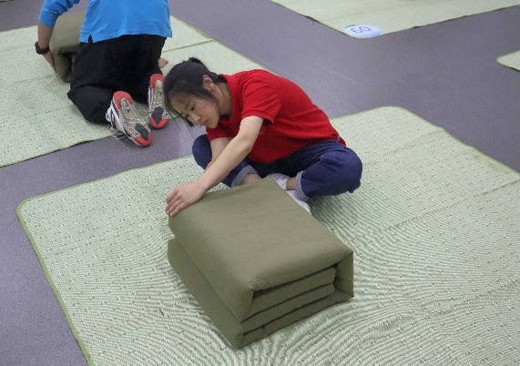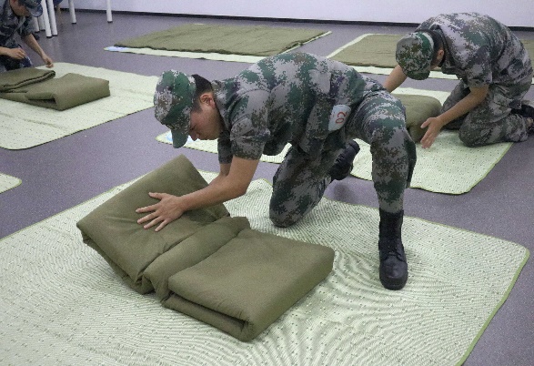大赛伊始,主持人向参赛人员们介绍了本次比赛的评分规则。在了解了比赛规则后,各组参赛选手按照要求在指点区域摆好棉被。随着一声令下,比赛正式开始。在比赛过程中,每个参赛选手动作娴熟,整个比赛井然有序。经过同学们折、压、跪、磨、捏、修等一系列动作后,一床床棱角分明、整齐划一的“艺术品”展现在大家的面前。在主持人宣布比赛结束后,大家立即停下动作,站在被子旁接受评审,评委们一一下场对参赛选手们的作品进行评分。