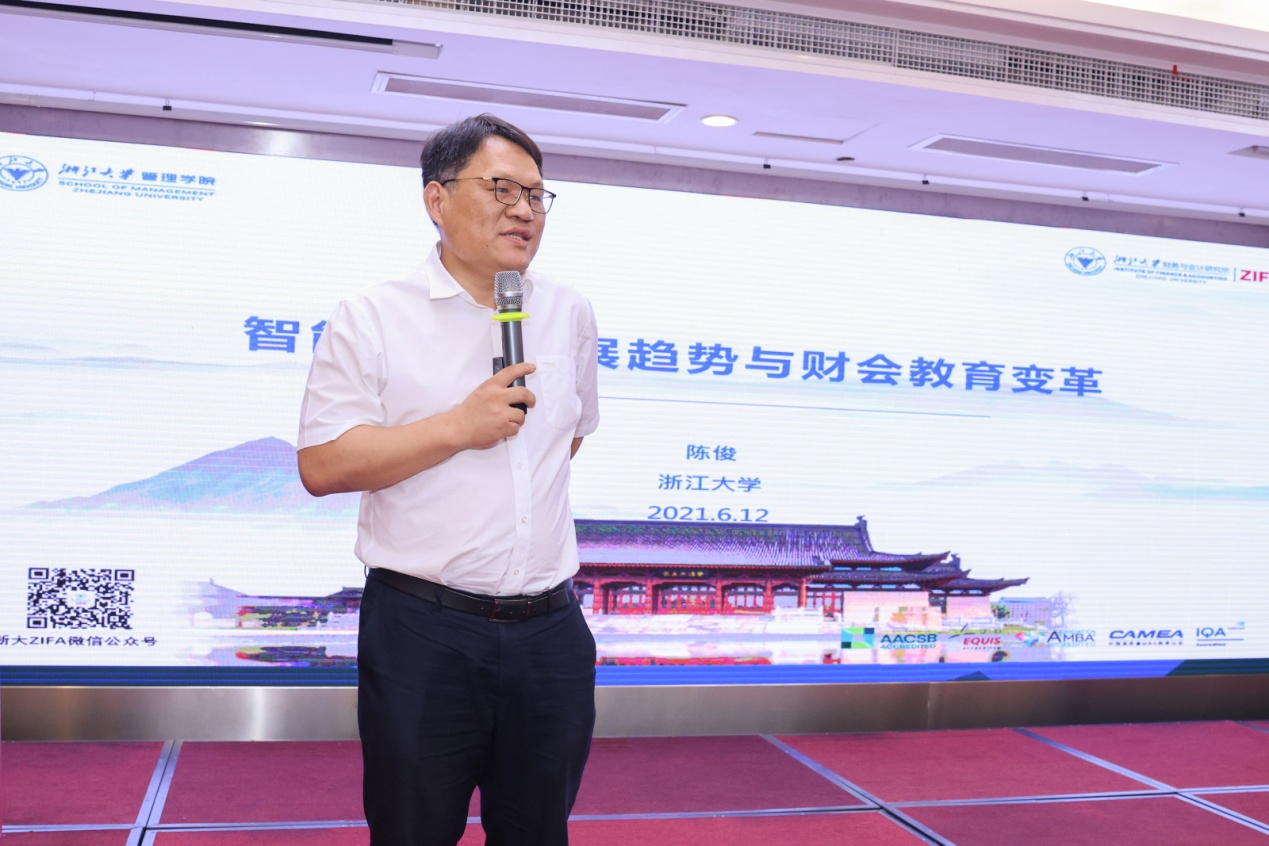 接着,浙江大学会计系主任、博士生导师陈俊教授作了《智能财务发展趋势与财会教育变革》的主题报告。陈俊教授在价值层面、组织层面上相继强调了会计存在的必要性,他表示在大智移云时代市场越发展、会计越重要,社会经济需求的动态变革和信息技术的迅猛发展为会计的成长提供了沃土,智能财务的发展能够更好地发挥会计跟财务的管理作用和决策价值,进而促进信息反映、监督控制、决策支持和价格实现。