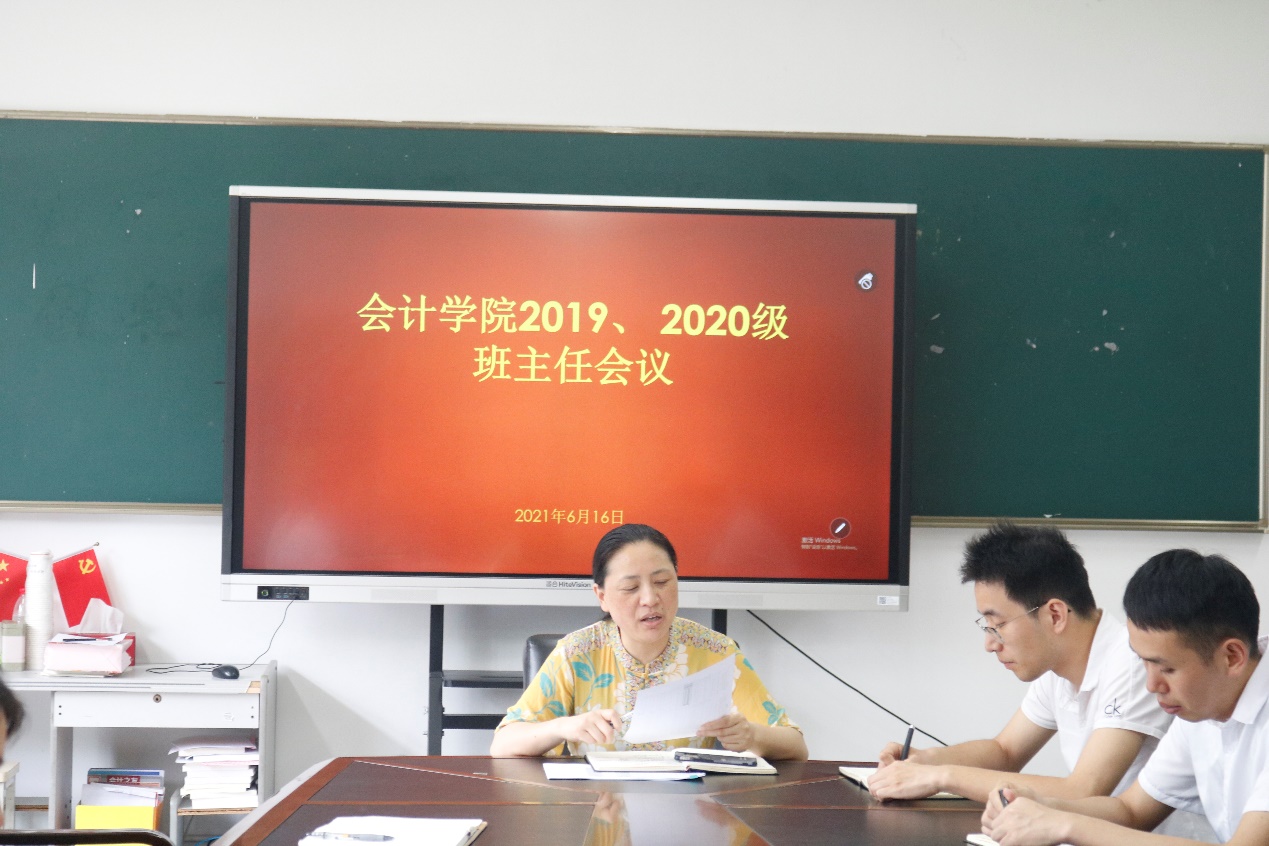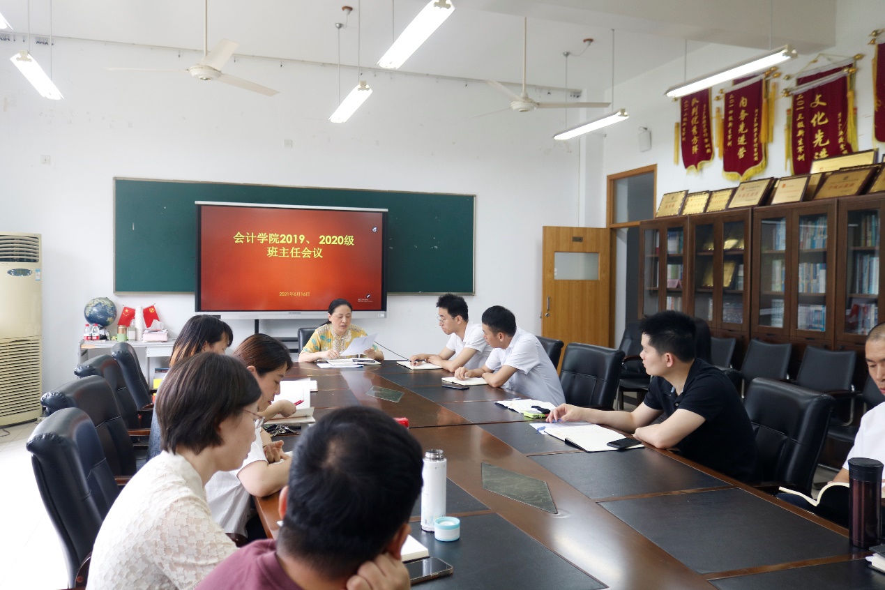 为加强学风学纪建设,进一步保证各项学生工作的有序开展,会计学院于6月16日下午13点30分在7218会议室召开2019、2020级班主任会议,会计学院党总支副书记张惠君,会计学院学工办副主任潘宁,2019、2020级班主任,年级辅导员叶君红、颜路路、李孟参加此次班主任会议。