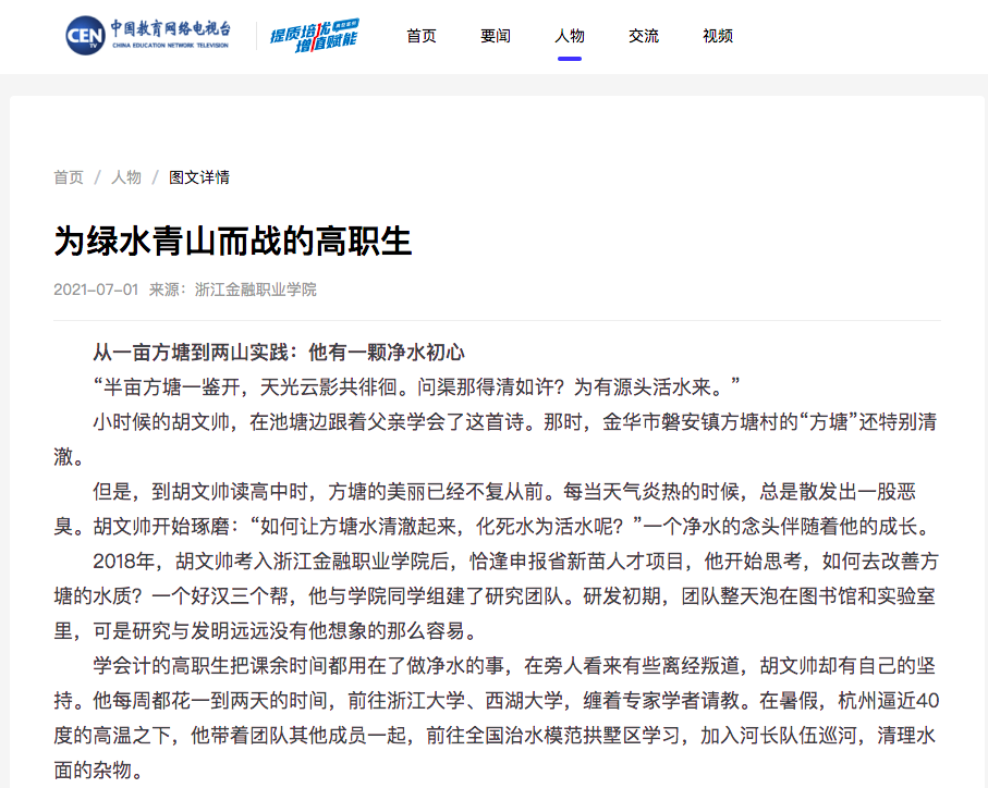 近日,教育部职成司下发《关于征集职业教育提质培优增值赋能典型案例的通知》,联合中国教育电视就“提质培优、增值赋能”优秀案例进行征集、遴选。自征集活动启动以来,1103所职业院校和地方教育行政部门积极参与,3430个典型案例在线提交,经过层层选拔,我院《为绿水青山而战的高职生》成功入选首批典型案例,并进入公开展示。