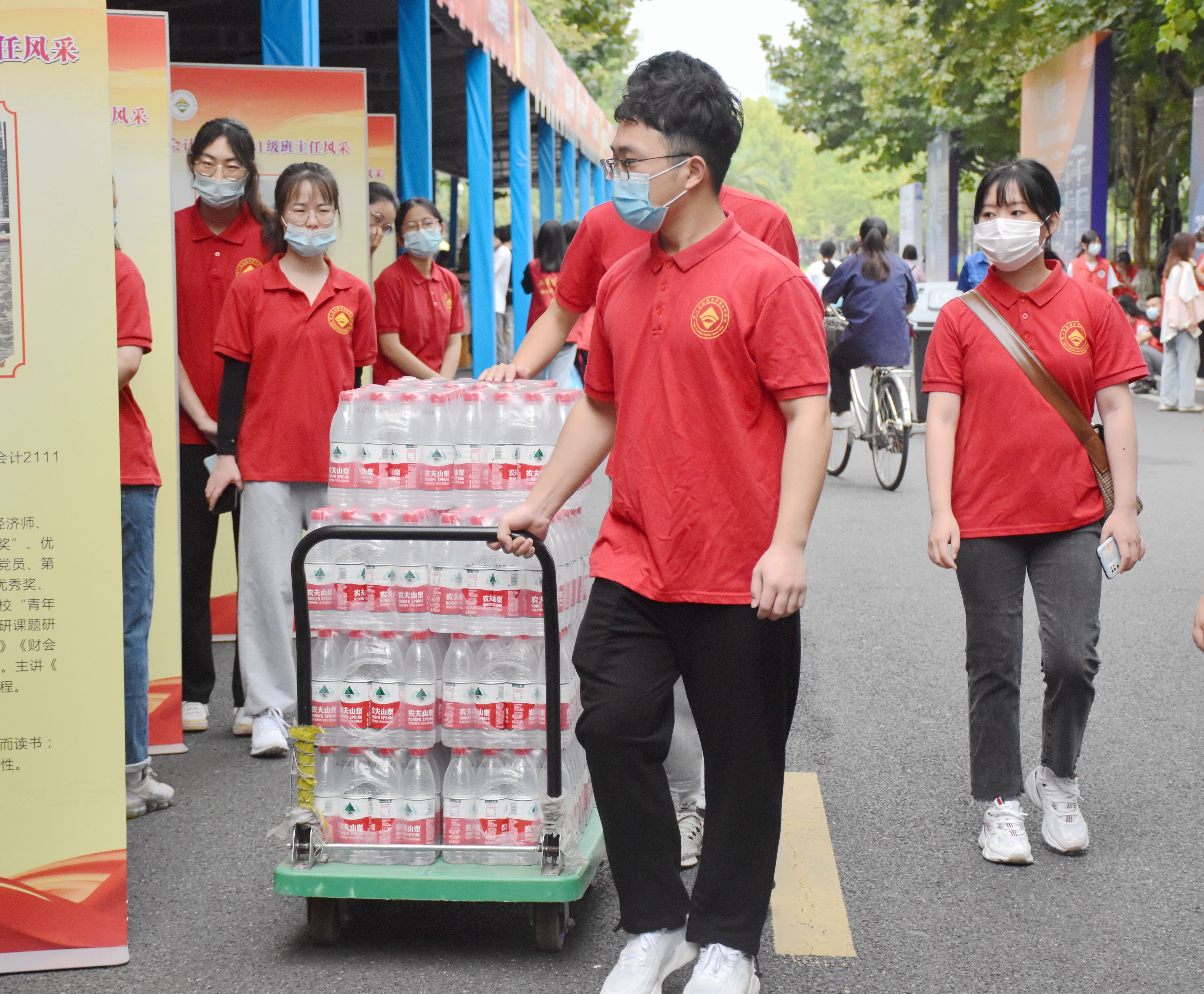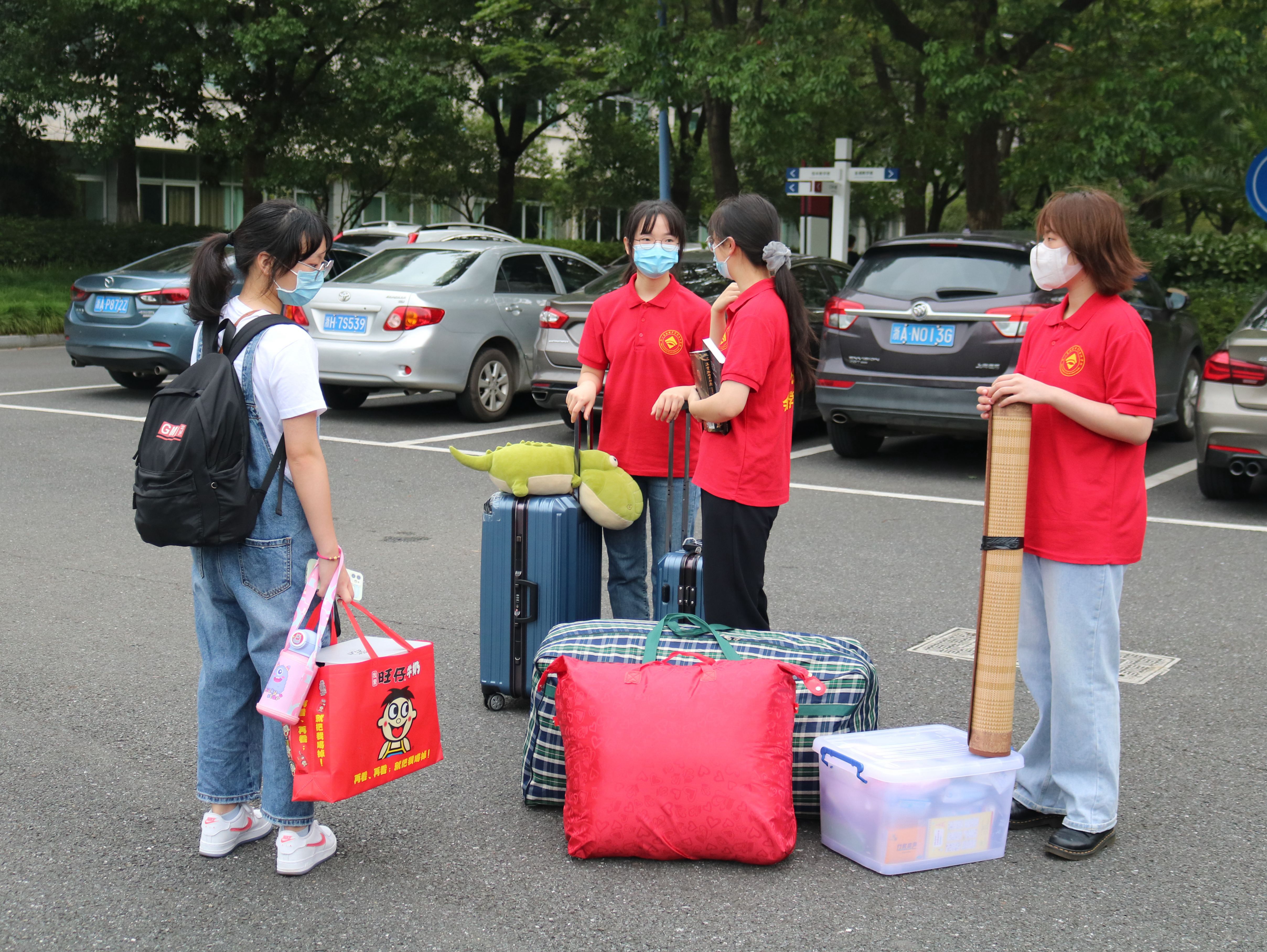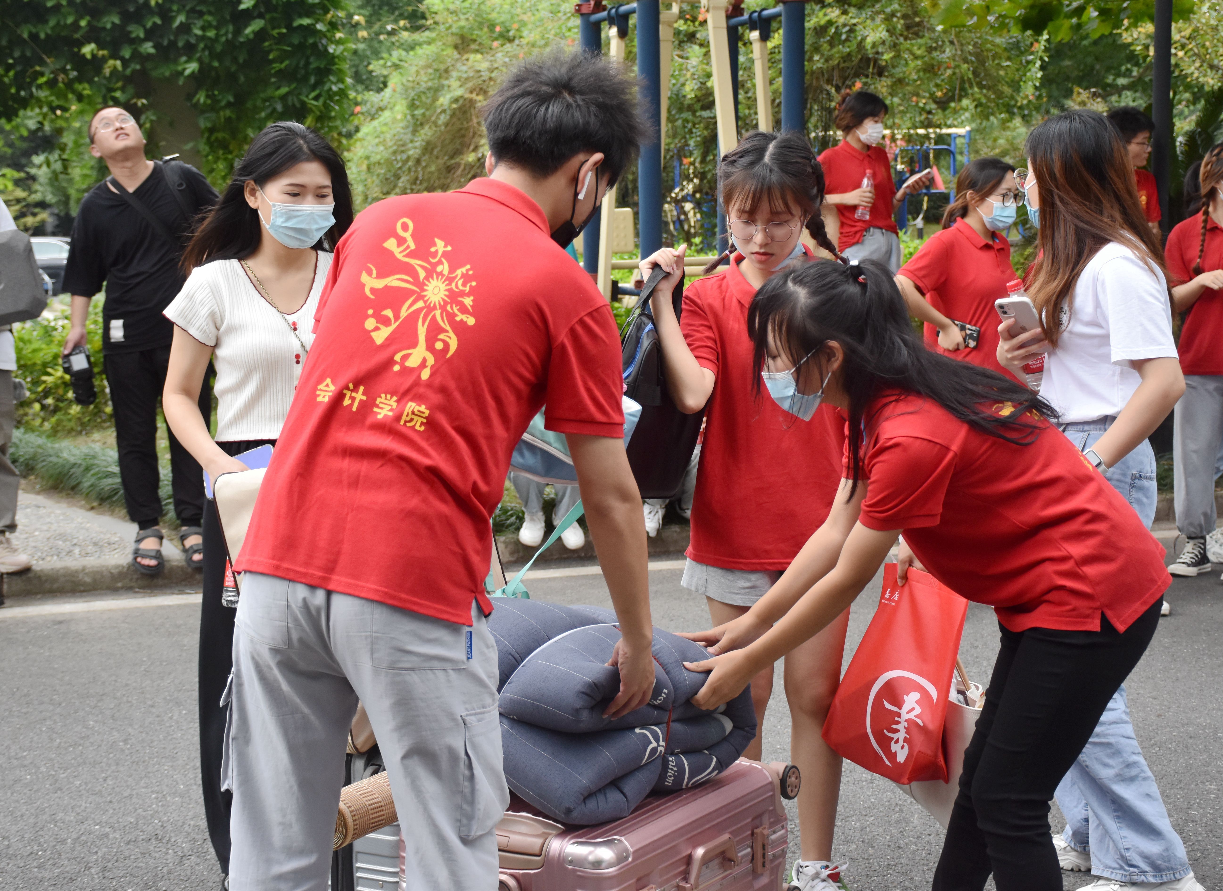 迎新志愿者们穿着小红衣分布于各个接待点,各司其职,奔走在报道点和宿舍楼之间,以良好的精神风貌为每一位新生提供热情、体贴的服务与帮助,让他们感受到温馨的集体生活氛围。