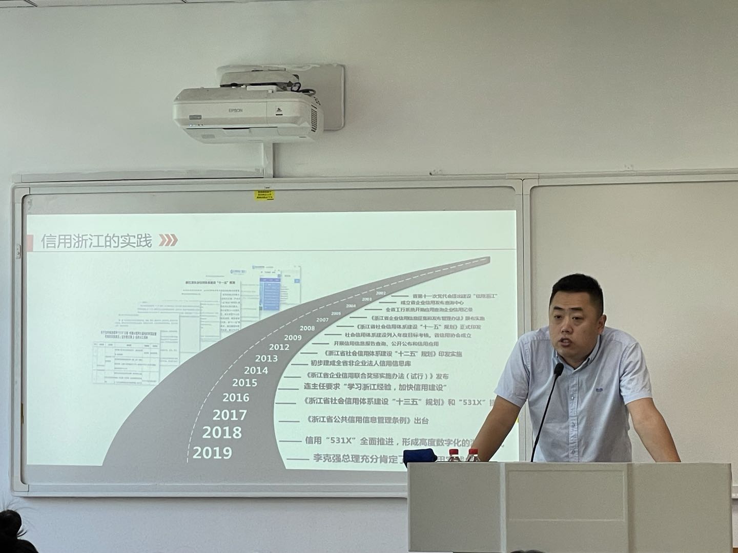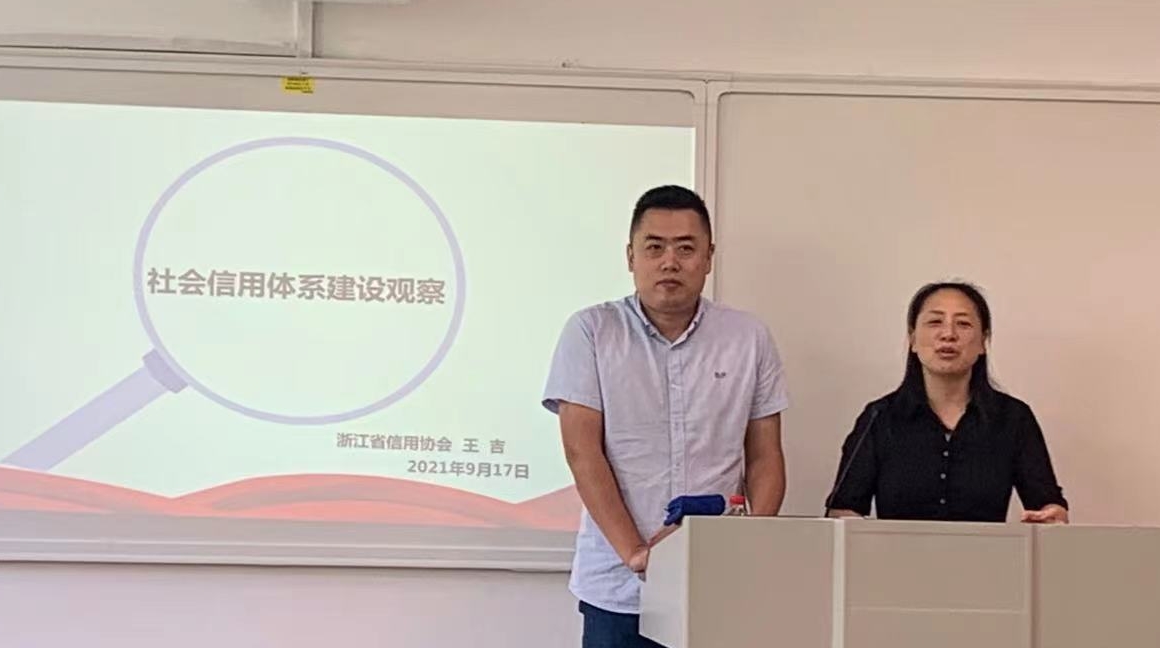 随后,王吉秘书长从国家层面的信用建设、信用浙江的实践以及学生在信用领域的应用场景等三个方面进行专题讲座,详细介绍了由发改委、人行、宣传部三体系推动的信用体系演进,着重讲解了信用浙江“531X”的推广,以支付宝信用分、职业背景调查等与学生息息相关的信用应用场景深入浅出地阐述信用领域的实践。王吉秘书长对在座的全体学生提出倡议:珍惜信用,从现在开始,养成良好的个人信用习惯。